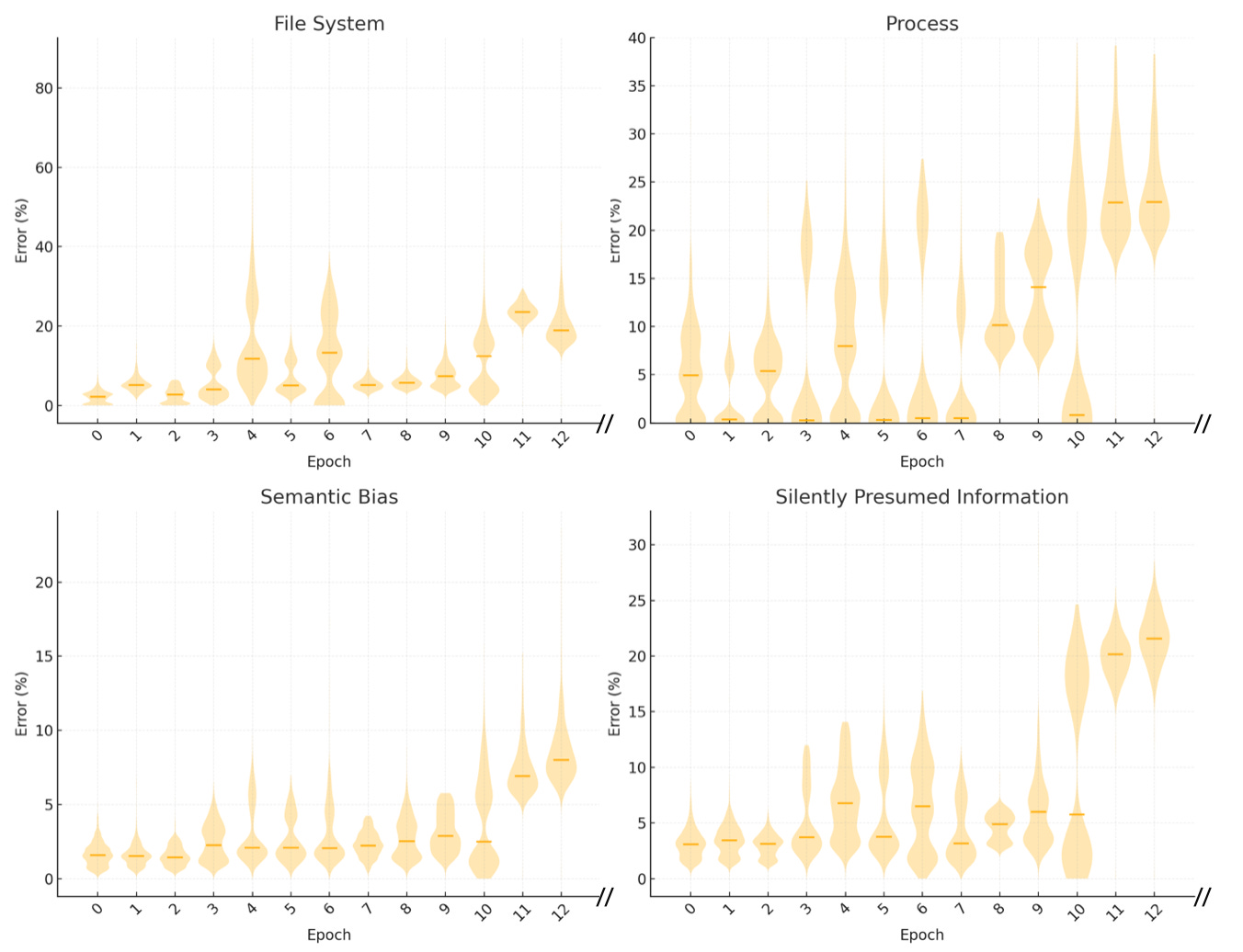 The error(%) consist of json entries(files, process, permissions, network etc.) where the predictions were wrong, some are further given semantical interpretation. Epochs only up to 12 are shown and typical session lasts for up to 100+ epochs.